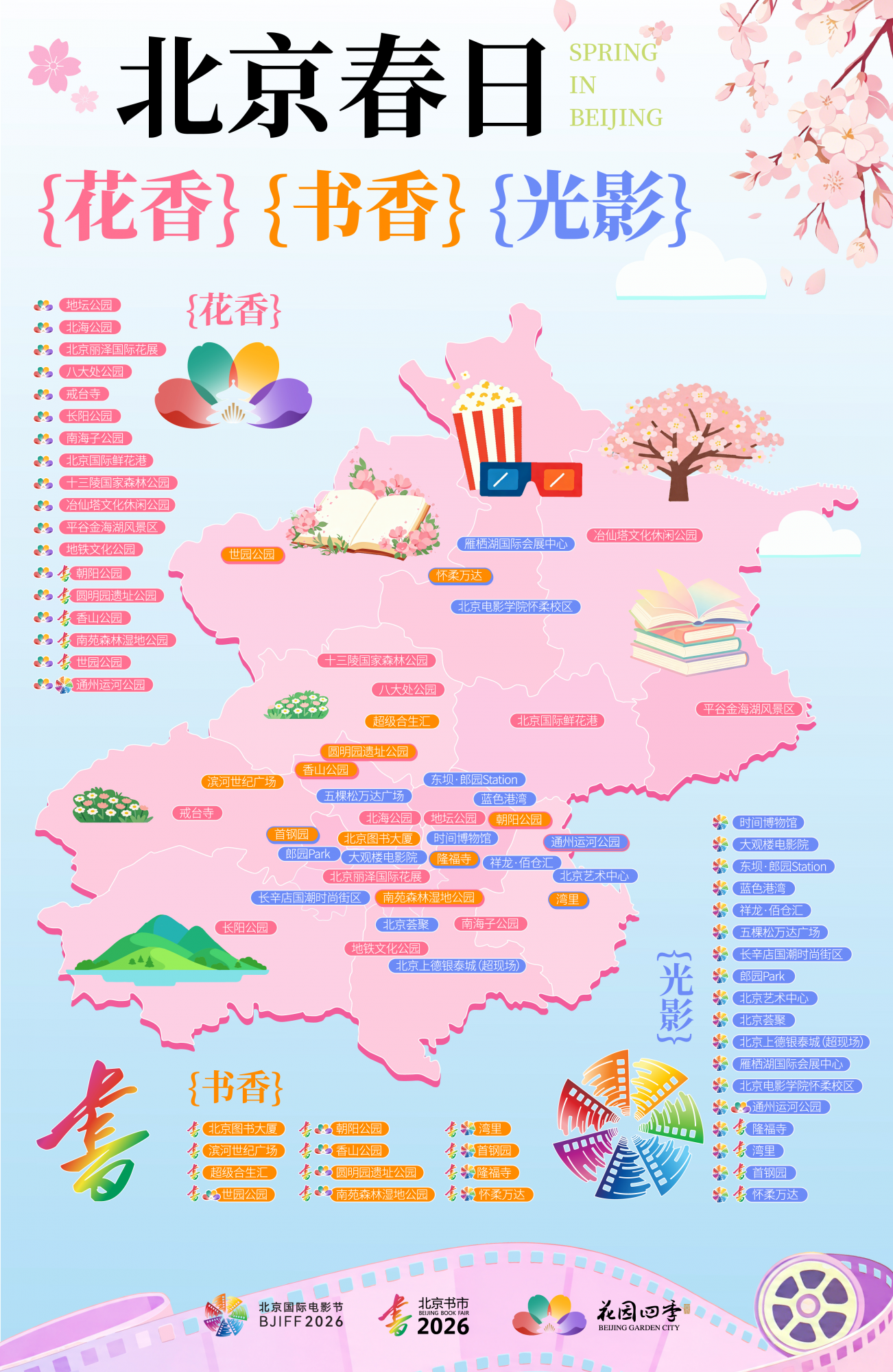 市民可按图索骥,赏“花开北京”“书香京城”“光影京华”,体验处处可赏花、处处可读书、处处可观影的美丽春日。